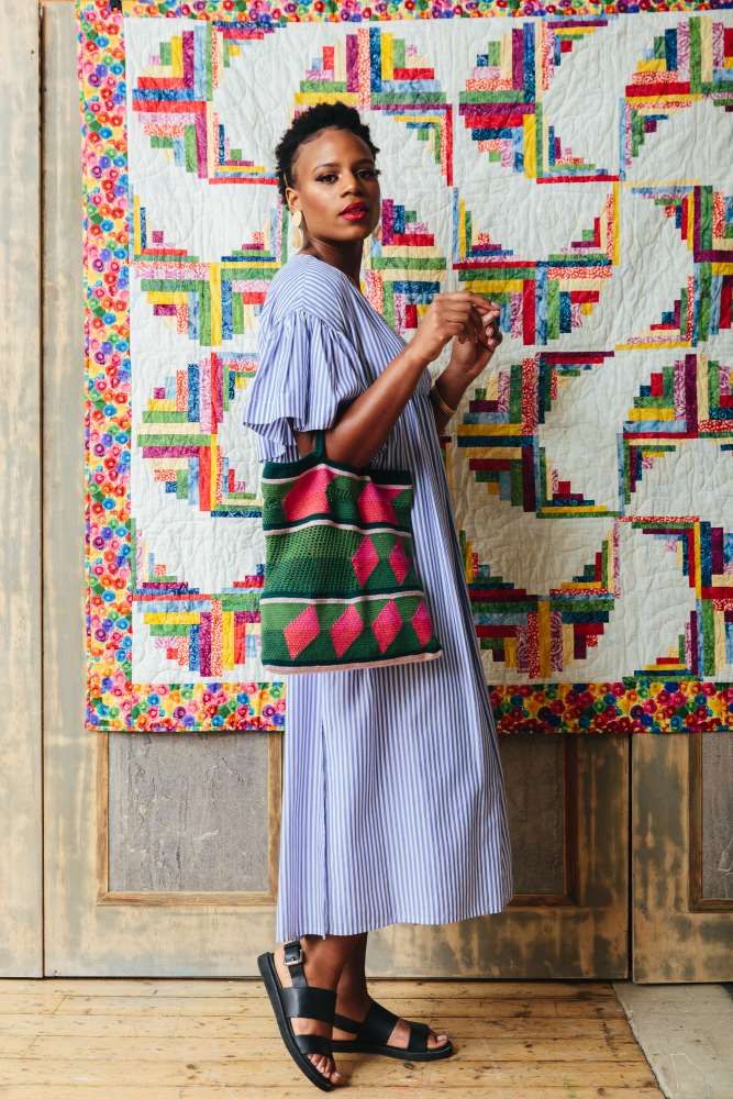 With a nod to classic quilting blocks, Lindsey Newns' Half-square Triangle Shawl is made in a luxurious Sweet Georgia Merino blend and is the perfect showcase for a mini-skein gradient pack. Kwannie Cheng's stunning Retro Tote and Purse set also features crisp block shapes and cleverly works filet panels into its striking geometric pattern.