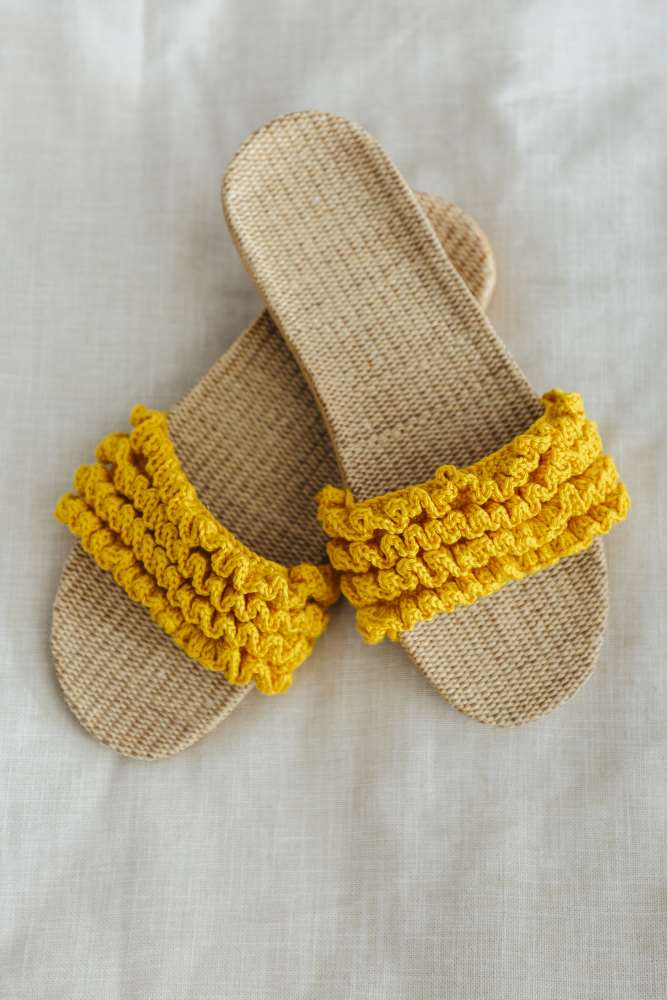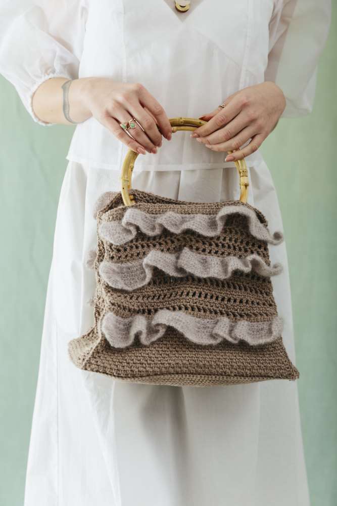 Cassie Ward’s Little Storm Dress is perfect for those squally days that are best spent indoors, and you can play with texture and shape as you make Kwannie Cheng’s Aura Ruffle Tote and Lucy Djevdet’s Shu Ruffle Sliders.