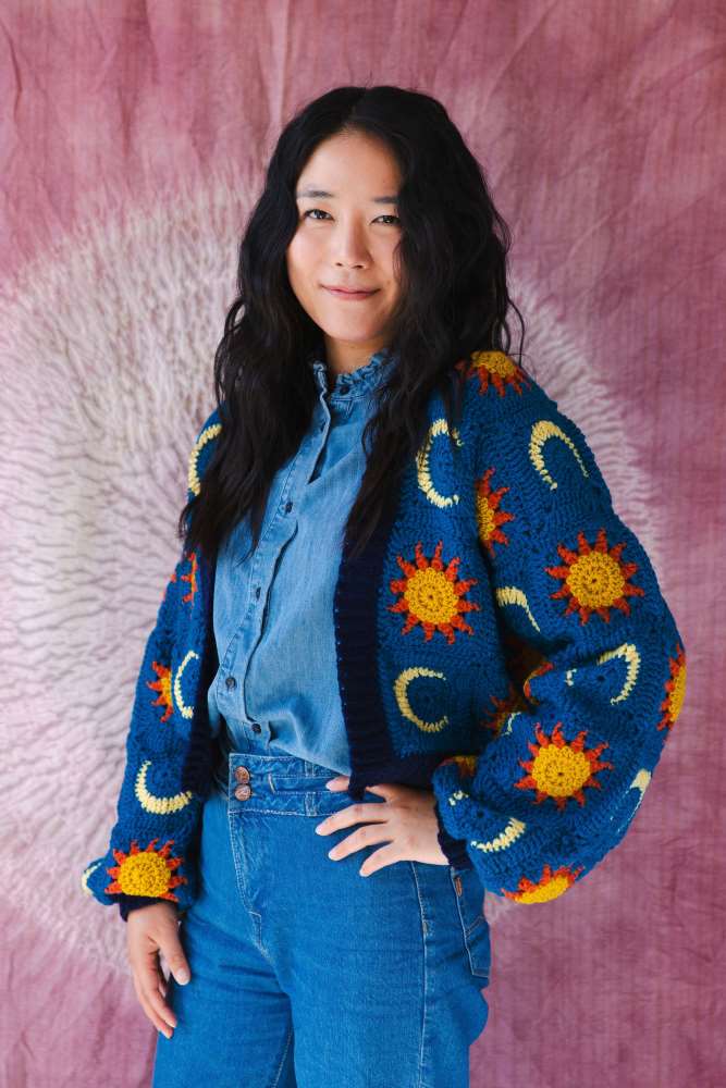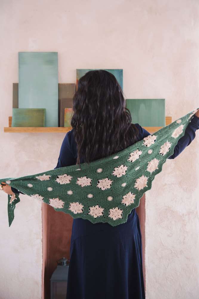 As well as shimmering styles, there are some fabulous motifs, including Cassie Ward’s Cosmic Cardigan with its sun and moon designs, and Katherine Laight’s beautiful Lyra Shawl inspired by the heroine in Philip Pullman’s Northern Lights trilogy of books.