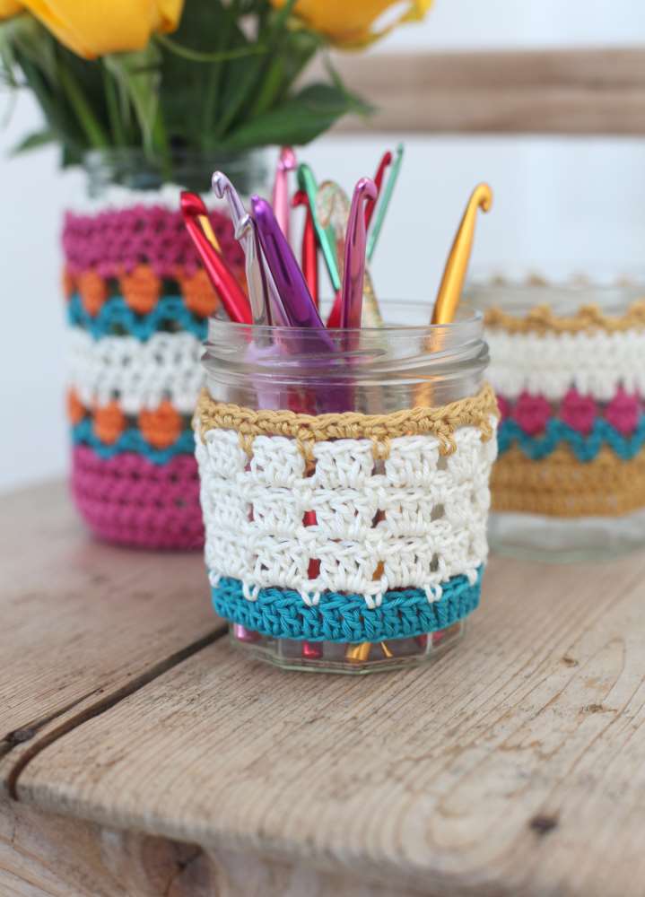 If you want to go all out for crochet in your table decorations, then add a pretty tea cosy, such as Emma Varnam's on page 77, and our columnist Emma Escott's jar cosies. These would make excellent tea light, cutlery or condiment holders or the perfect colourful, informal vase and what a thrifty way to recycle empty jam jars after all those cream teas!