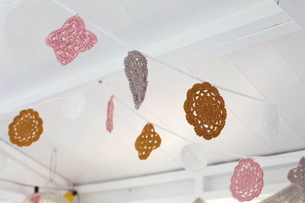 In addition, if you aren't particularly green-fingered (or even if you are) then hook some bright projects for your garden, which will bring colour to any corner that has failed to bloom. Valerie Bracegirdles garland is the perfect outdoor party bunting, which you can leave out all summer long.