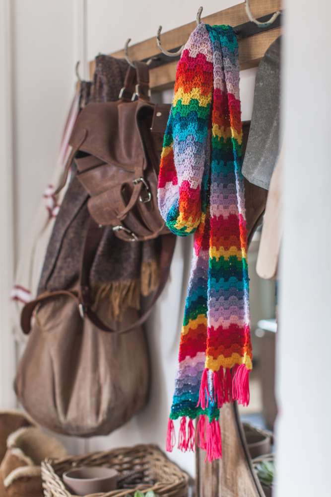 Helda Panagary's striking scarf utilises bold colours alongside an unusual stitch to great effect on page 58. Worked in one of our favourite super-soft MillaMia yarns, the blocks of rainbow colours created by a slip stitch technique look bright, pure and luminous.