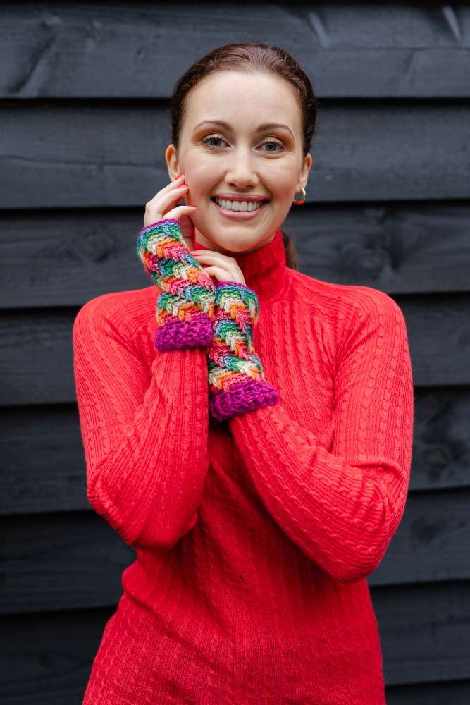 The delicate lace panel and picot edging on these mitts are so easy to hook, but add a touch of prettiness to any everyday accessory.