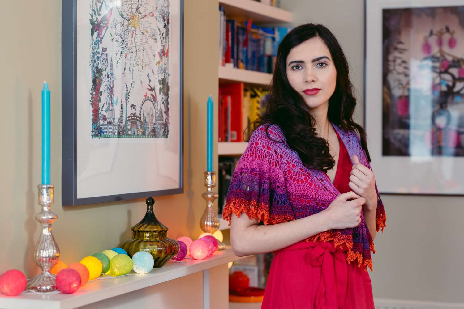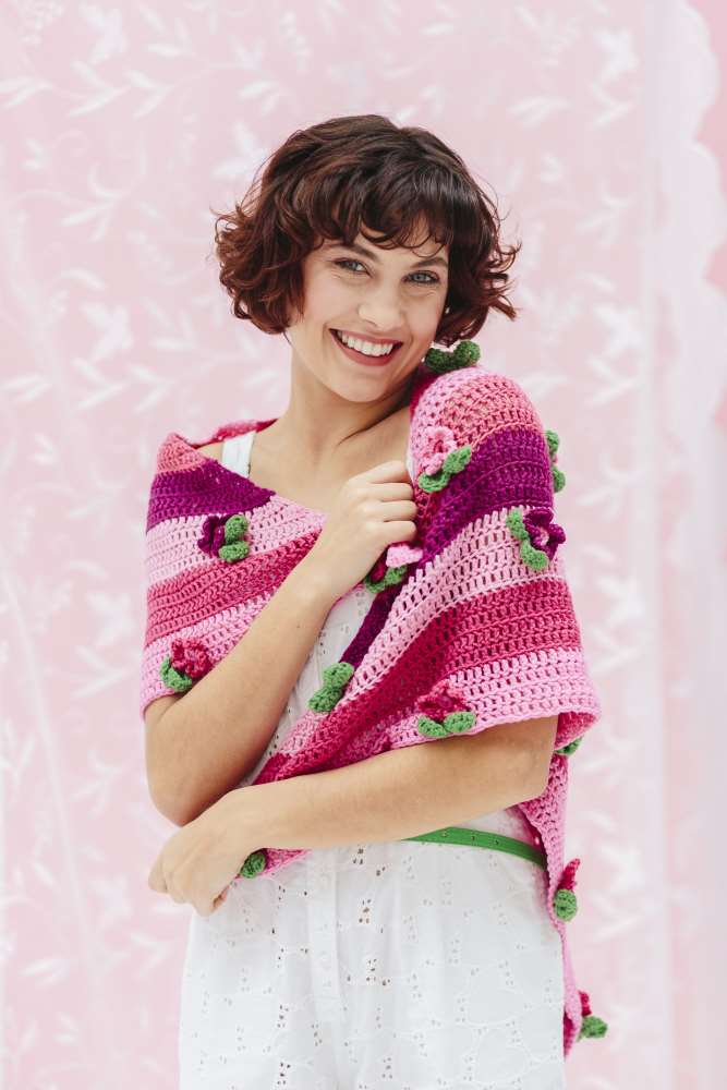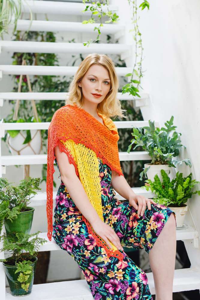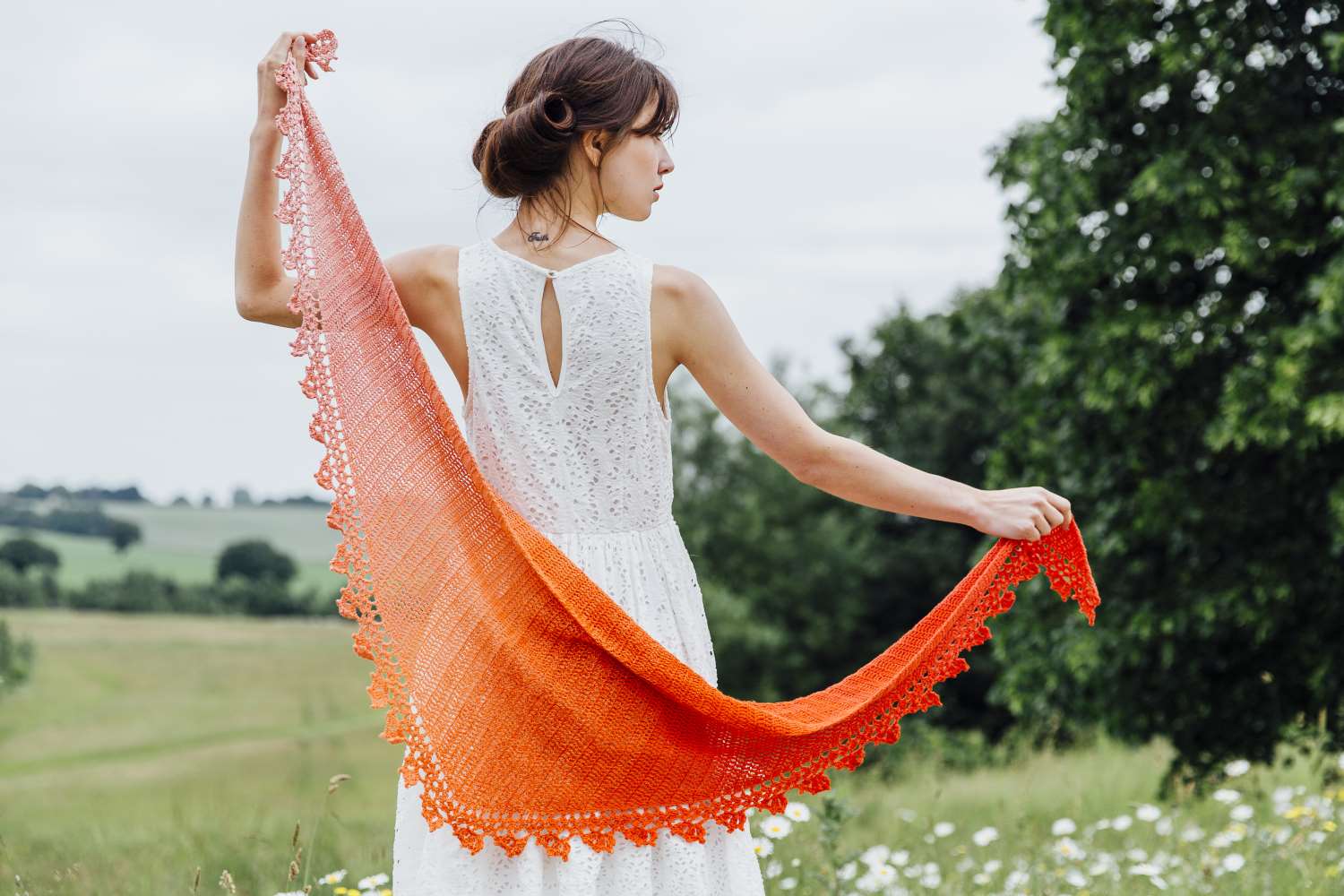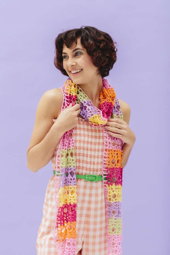 Katia Spring Rainbow would be a perfect alternative yarn to use here, or any DK-weight gradient yarn will achieve a similar colour effect. Any standard DK-weight cotton/acrylic blend yarn would be suitable to make the shawl.